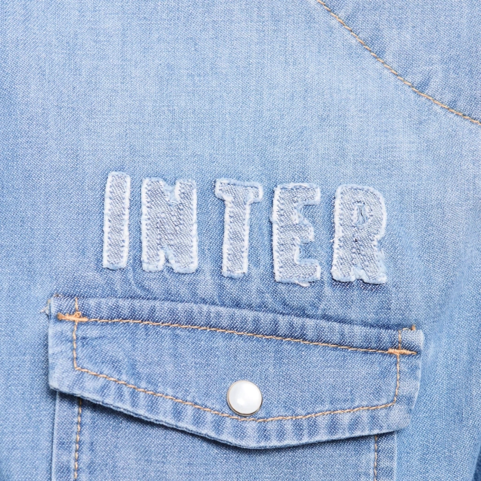 La camicia Denim è personalizzata con ricamo Snake sul taschino e scritta Inter. Bottoni effetto madreperla.