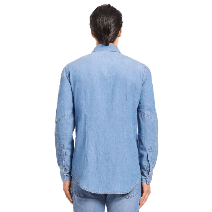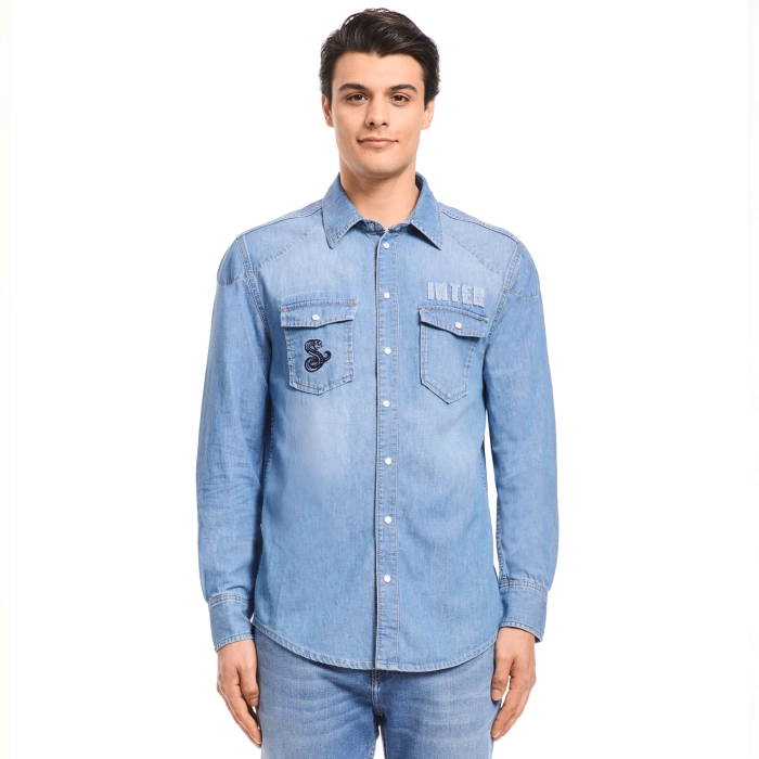 La camicia Denim è personalizzata con ricamo Snake sul taschino e scritta Inter. Bottoni effetto madreperla.
