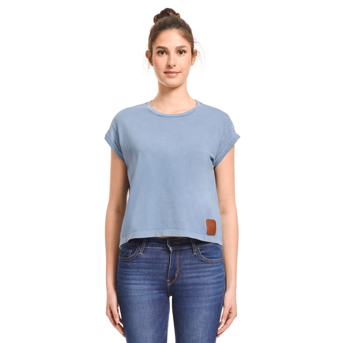 Il crop top stone wash effetto denim è realizzata in morbido jersey di cotone. Presenta una label scamosciata personalizzata con logo Inter.