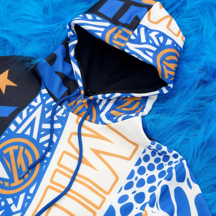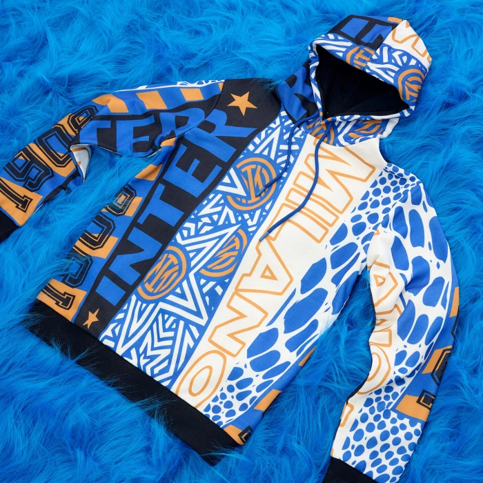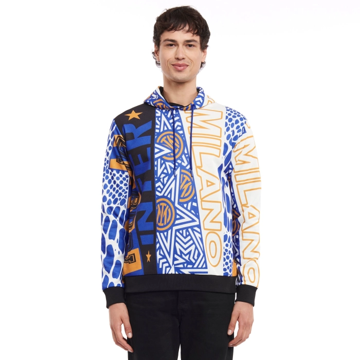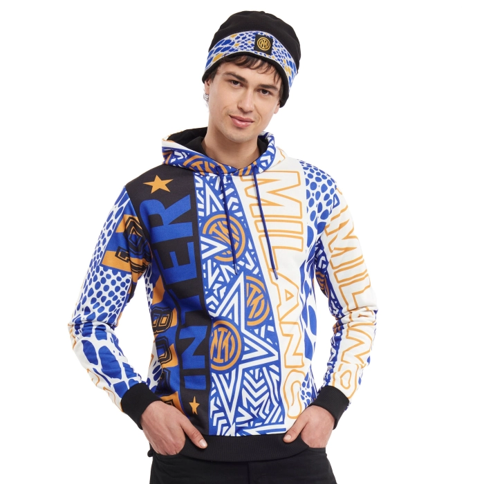 La felpa con cappuccio multi logo INTER è il capo indispensabile da indossare durante l'inverno. È realizzata con un tessuto morbido e caldo, con costina elastica ai polsi e al fondo. Ha una fantasia declinata con i colori nero, blu e giallo che rispecchia l'identità del club. Vestibilità regolare.