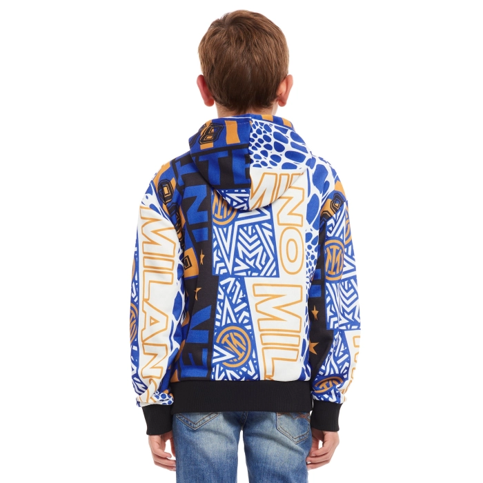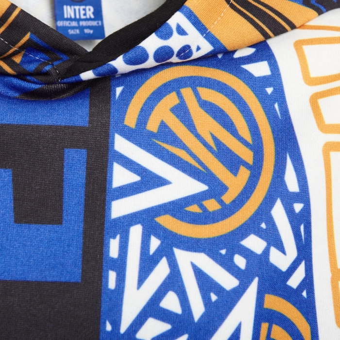 La felpa con cappuccio multi logo INTER è il capo indispensabile da indossare durante l'inverno. È realizzata con un tessuto morbido e caldo, con costina elastica ai polsi e al fondo. Ha una fantasia declinata con i colori nero, blu e giallo che rispecchia l'identità del club. Vestibilità regolare.