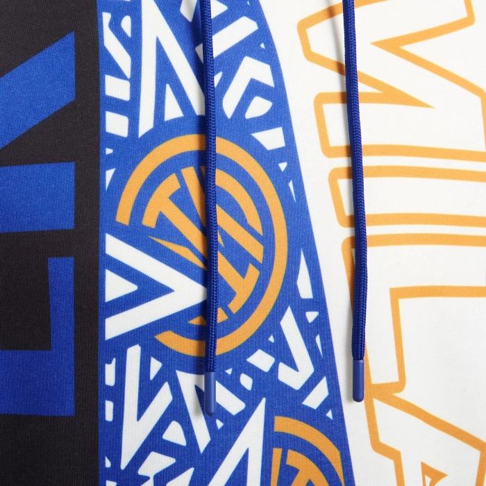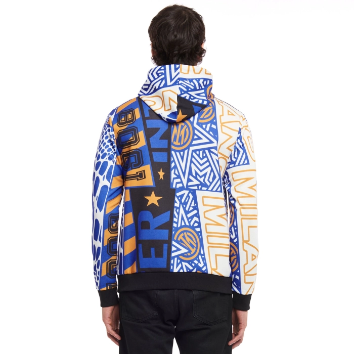 La felpa con cappuccio multi logo INTER è il capo indispensabile da indossare durante l'inverno. È realizzata con un tessuto morbido e caldo, con costina elastica ai polsi e al fondo. Ha una fantasia declinata con i colori nero, blu e giallo che rispecchia l'identità del club. Vestibilità regolare.