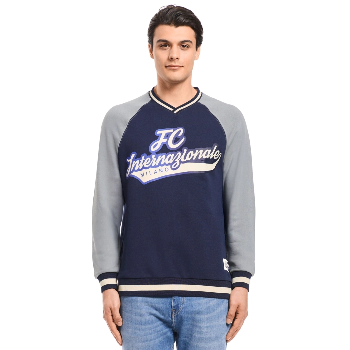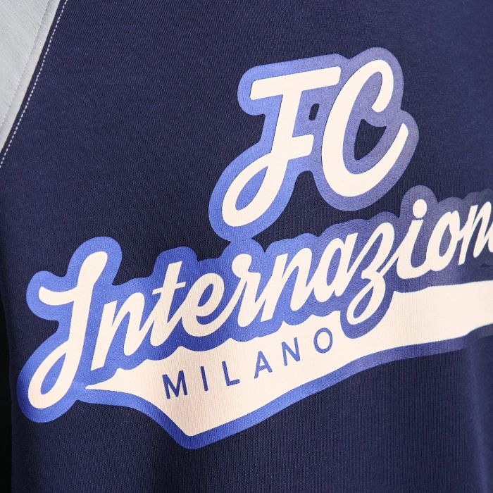 La felpa girocollo Baseball è personalizzata con scritta fading FC INTERNAZIONALE MILANO e label con logo del club. È costruita con manica raglan e ha una vestibilità leggermente oversize.