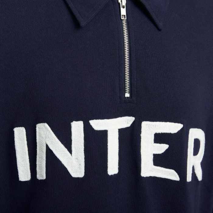 Il maglione retro del 1949 è realizzato in 100% cotone. Presenta un colletto a polo e zip a un quarto. La scritta INTER è realizzata con una particolare tecnica di ricamo vecchio stile.