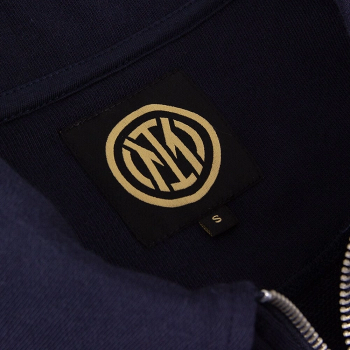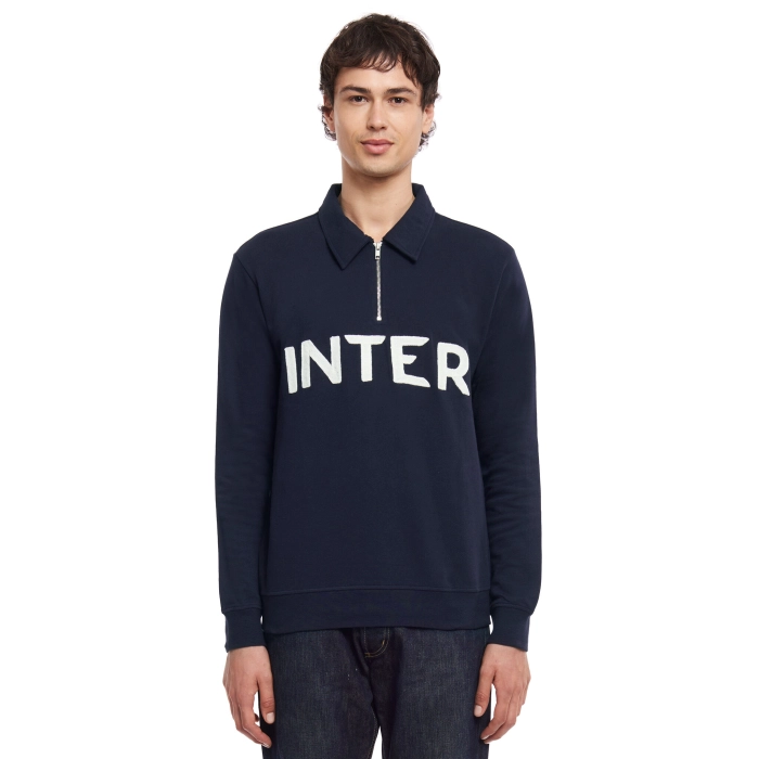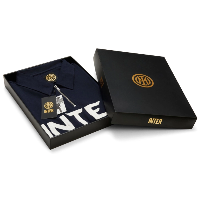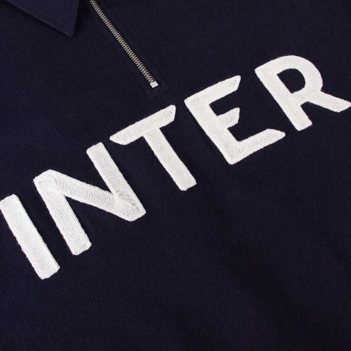 Il maglione retro del 1949 è realizzato in 100% cotone. Presenta un colletto a polo e zip a un quarto. La scritta INTER è realizzata con una particolare tecnica di ricamo vecchio stile.