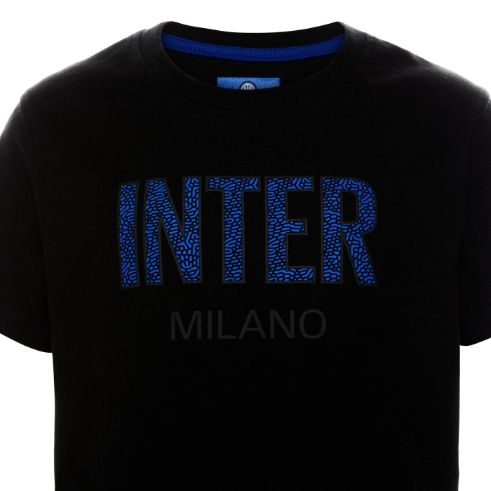 T-shirt INTER manica corta in jersey di cotone con collo in costina elasticizzata, parasudore interno collo in contrasto colore. Stampa centrale con i colori della squadra, logo INTER spessorato in colore argento sul retro.