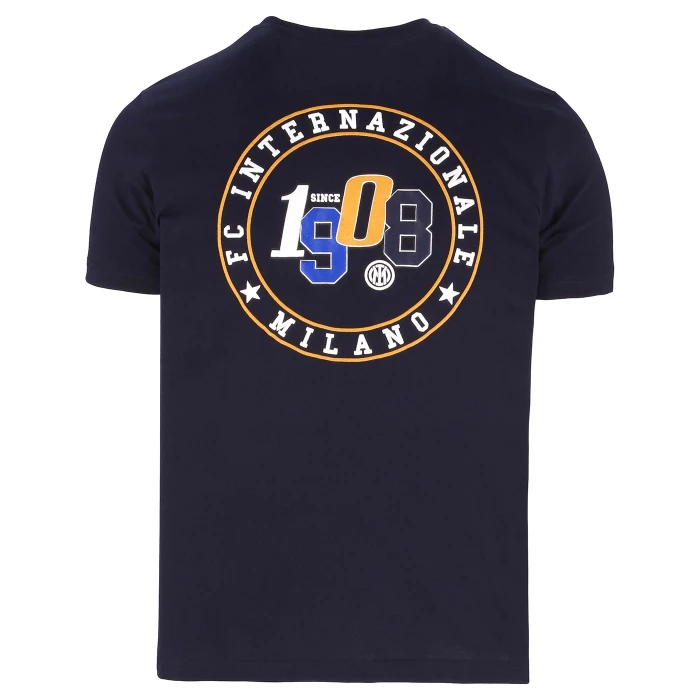 T-shirt girocollo in cotone dal look sportivo e contemporaneo, ideale per i veri tifosi nerazzurri.<br />Il fronte presenta la scritta “INTER” in evidenza, mentre sul retro spicca una grafica circolare in rilievo con la data “1908” – a richiamo dell’anno di fondazione – la scritta Milano, il nome ed il logo del club. Il design è valorizzato da dettagli a contrasto su collo e maniche con motivo grafico ripetuto, per un tocco distintivo e autentico. Perfetta da indossare nel tempo libero o per sostenere la squadra in ogni occasione.<br /><br />- Vestibilità regolare<br />- 100% cotone.