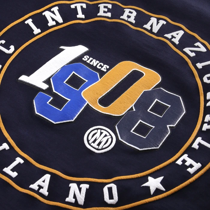 T-shirt girocollo in cotone dal look sportivo e contemporaneo, ideale per i veri tifosi nerazzurri.<br />Il fronte presenta la scritta “INTER” in evidenza, mentre sul retro spicca una grafica circolare in rilievo con la data “1908” – a richiamo dell’anno di fondazione – la scritta Milano, il nome ed il logo del club. Il design è valorizzato da dettagli a contrasto su collo e maniche con motivo grafico ripetuto, per un tocco distintivo e autentico. Perfetta da indossare nel tempo libero o per sostenere la squadra in ogni occasione.<br /><br />- Vestibilità regolare<br />- 100% cotone.