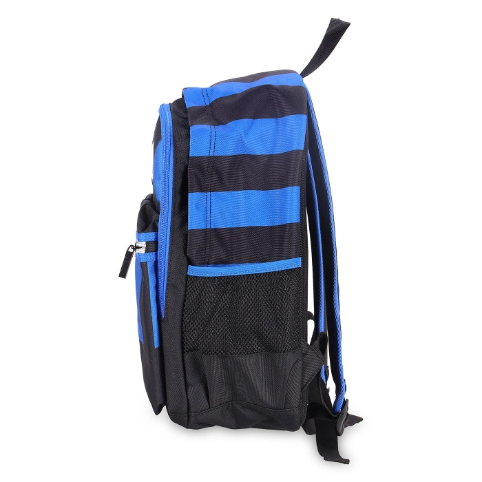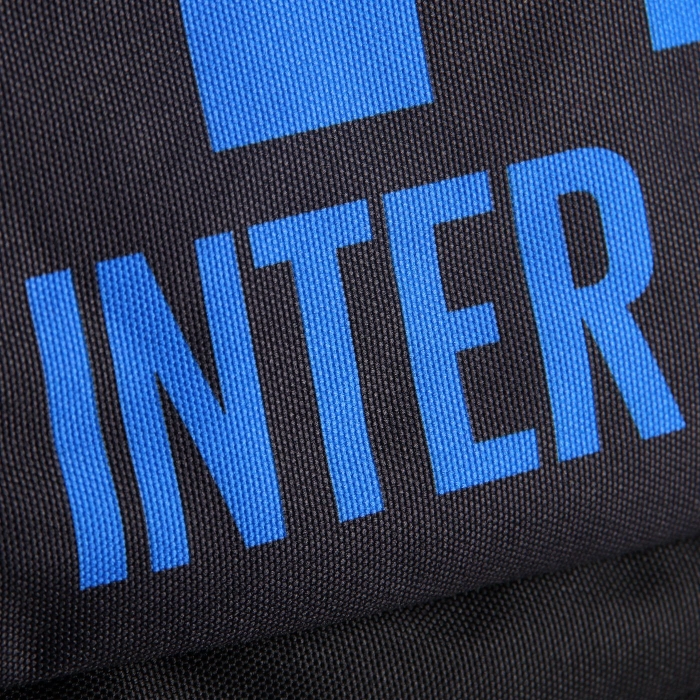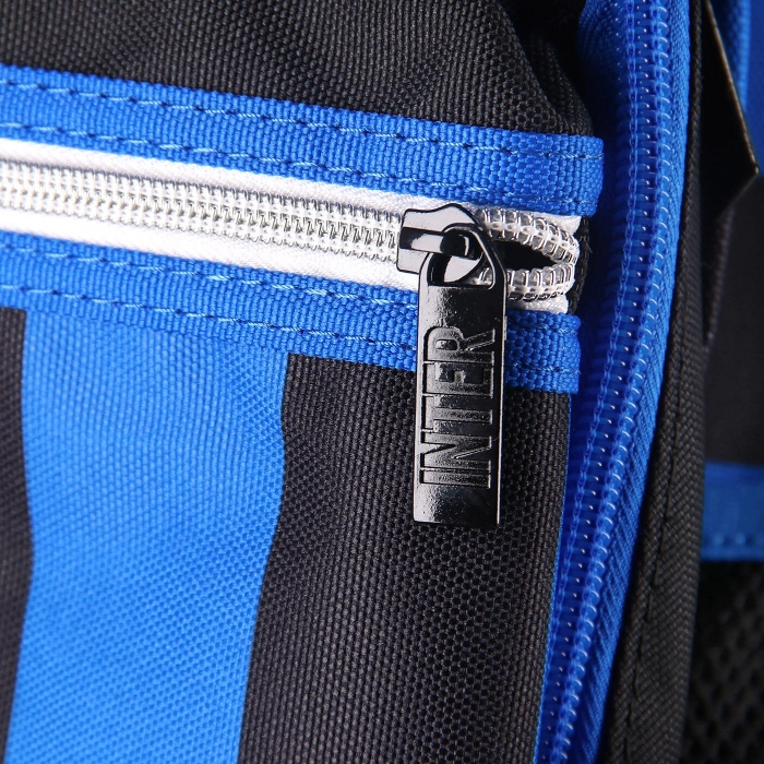 Lo zaino INTER, realizzato da Seven®, presenta doppio scomparto, apertura con cerniera, tasca in rete laterale porta borraccia, zip della tasca argentata. Tirazip personalizzati. Bordature in tono su tasca. Grafiche stampate a transfer. Etichetta rifrangente con anno di fondazione del Club applicata con cucitura. Etichetta logo in gomma applicata con cucitura. Schienale imbottito e rivestito in tessuto. Spallacci imbottiti e rivestiti in tessuto con sottospallaccio in rete.